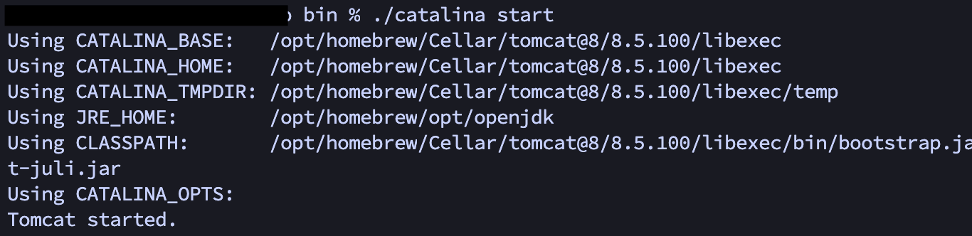 cd /opt/homebrew/Cellar/tomcat@8/8.5.100/bin // catalina 파일이 있는 위치로 이동 (버전에 따라 디렉토리명이 다를 수 있습니다)