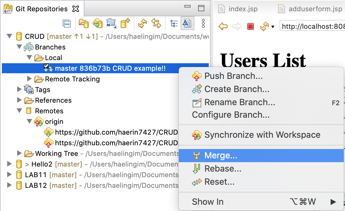 8. git repositories에서 Branches > Local > master.. 우클릭해서 merge 클릭