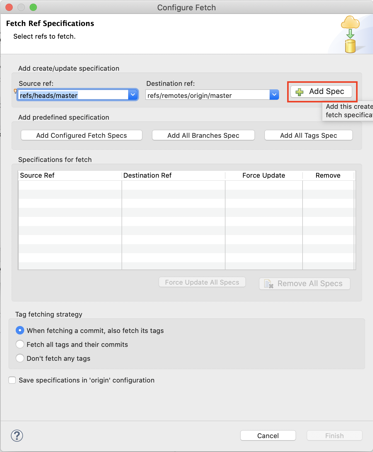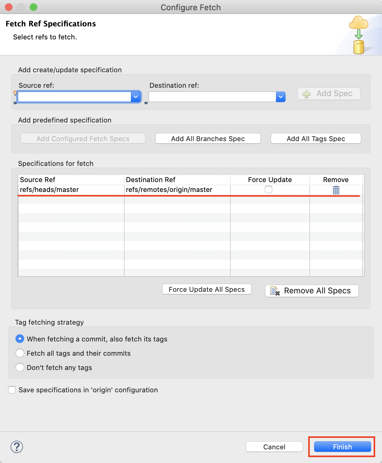 5. 왼쪽 이미지 빨간박스처럼 Specifications for fetch에 무언가 있다면 휴지통 버튼을 눌러 지우고 아래 사진처럼 클릭
