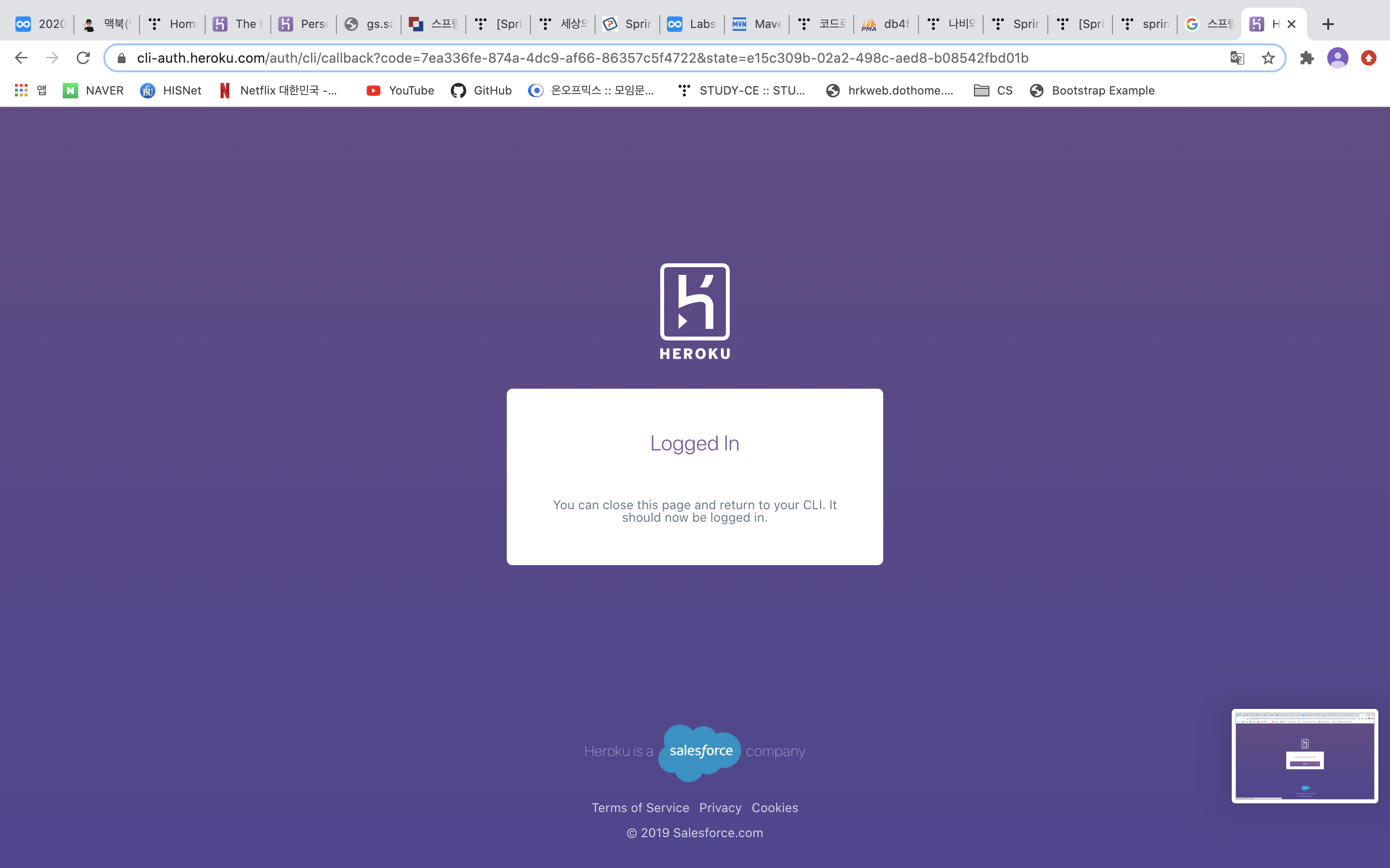 - 설치 확인 : terminal에서 heroku --version 명령어로 확인 & heroku login 명령어로 사이트로 넘어가서 로그인하기