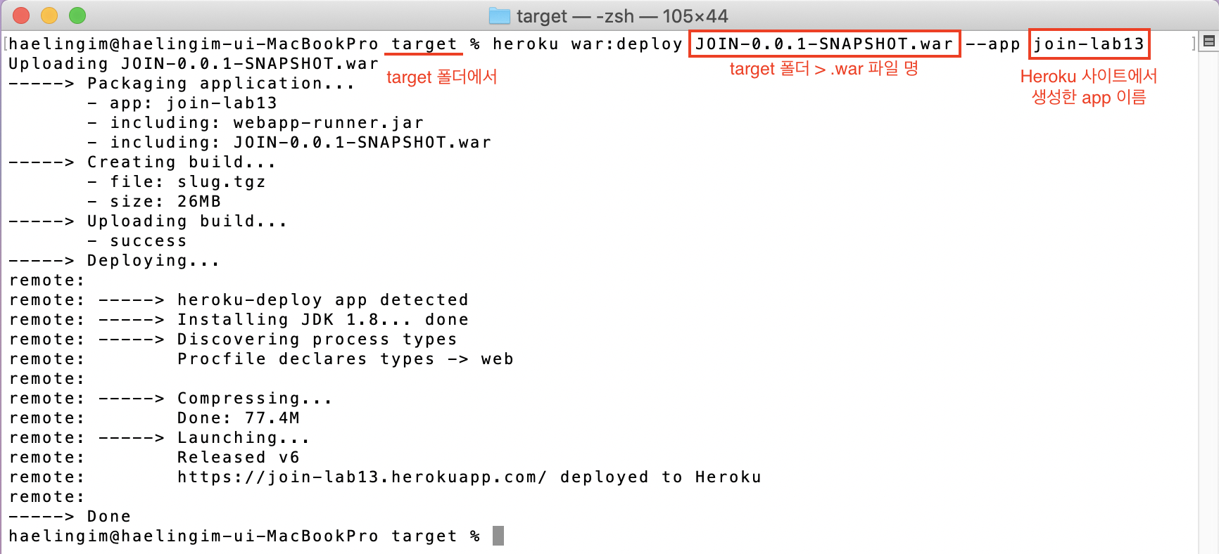 3. 이동한 target 폴더에서 heroku war:deploy 프로젝트명-0.0.1-SNAPSHOT.war --app 앱이름