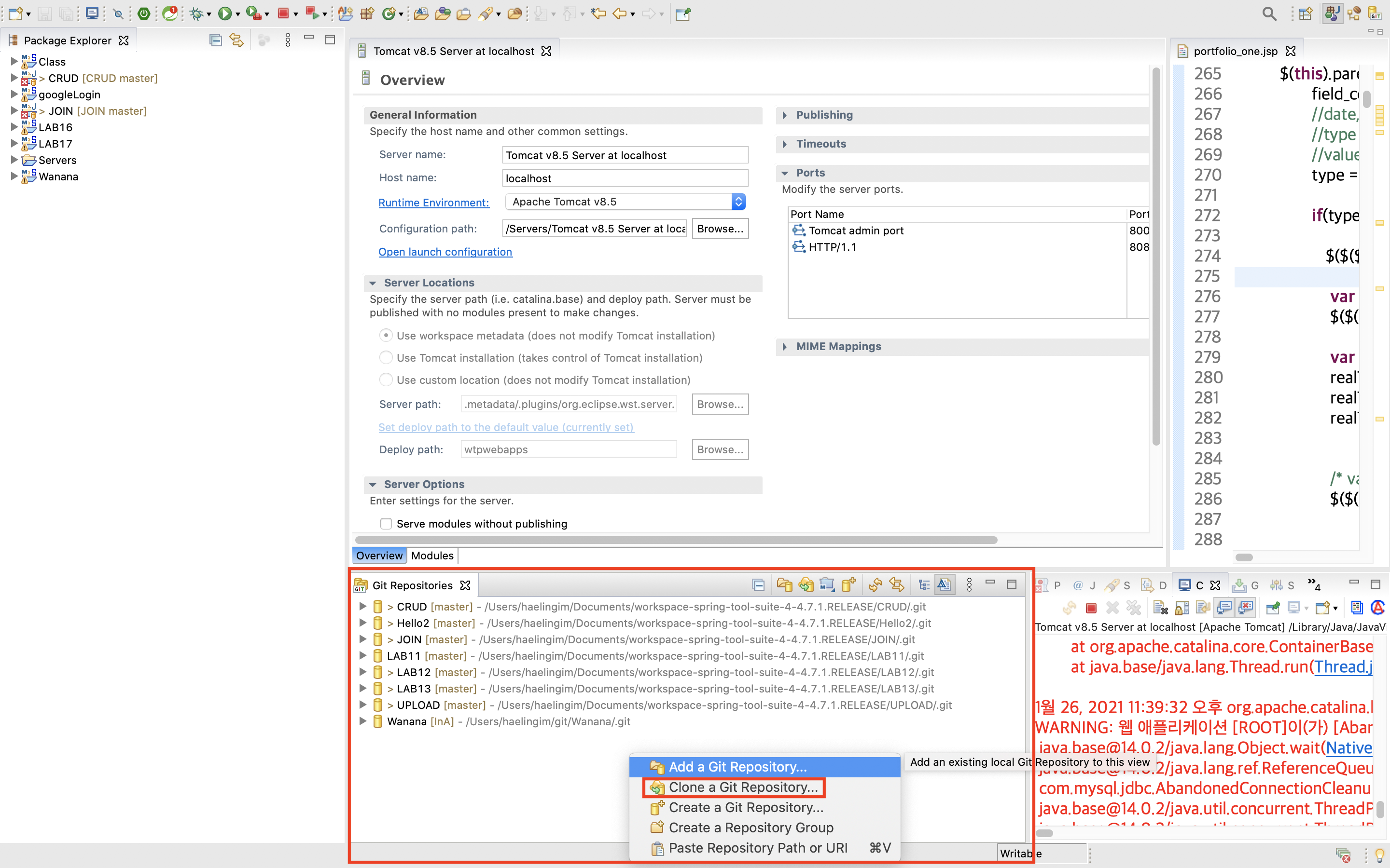 2. 스프링 git repository에서 오른쪽 파우스 클릭에서 clone a Git Repository.. 클릭