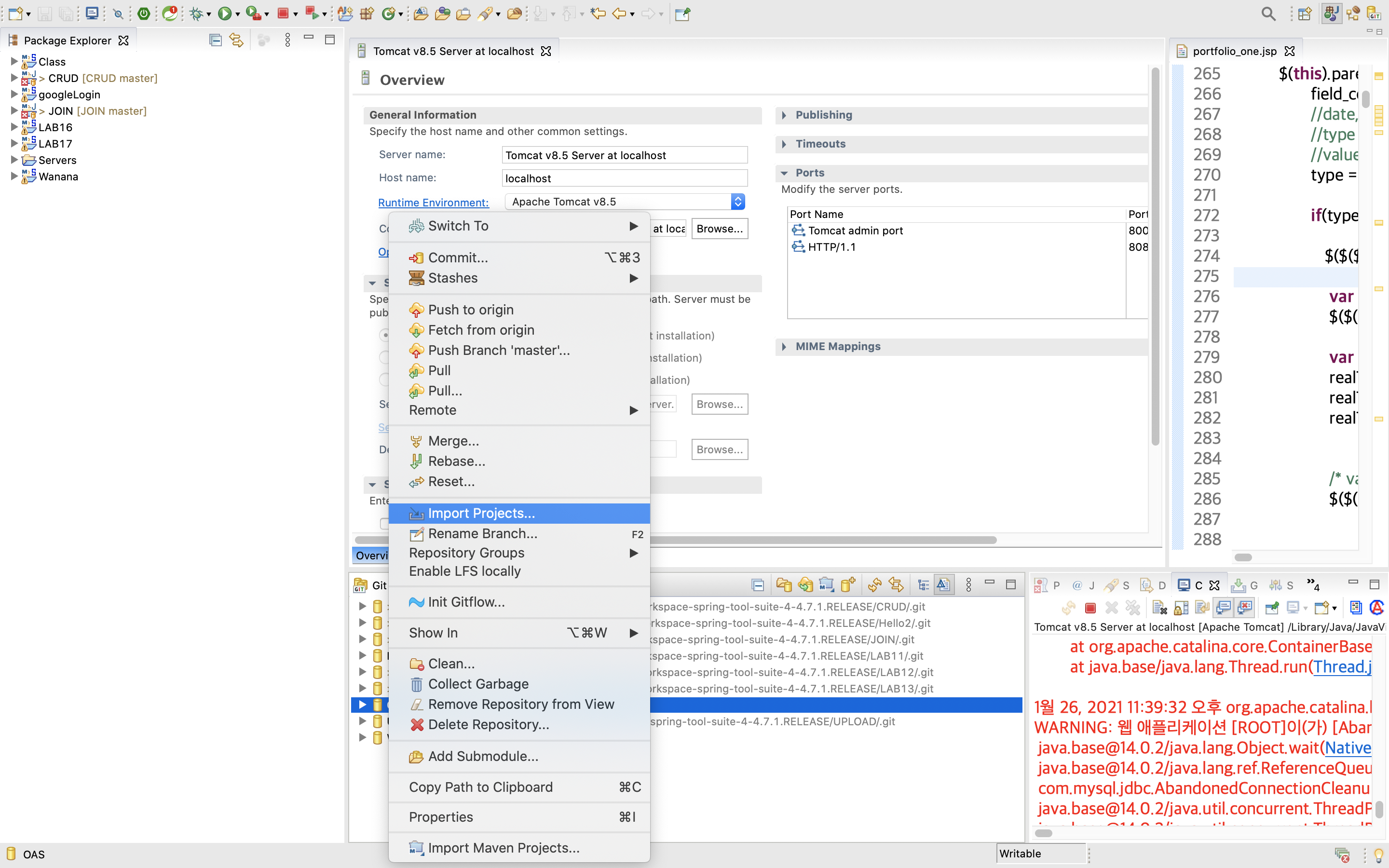 import 후 프로젝트 Run on server가 안 보일 수있는데, 그때 프로젝트 우클릭 > maven > update 시도하기