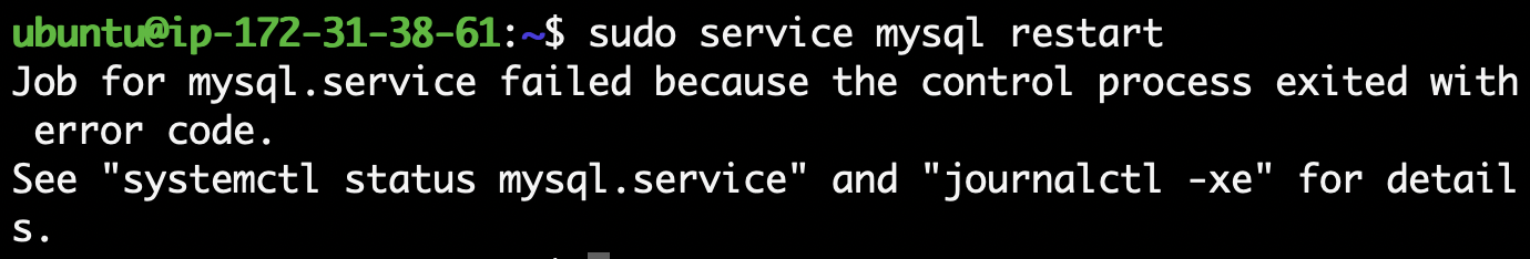 ▶혹시 아래와 같이 에러가 발생한다면, error.log를 확인하자 (나의 경우는 mysqld.cnf 수정할 때 만든 오타 때문이었다..)