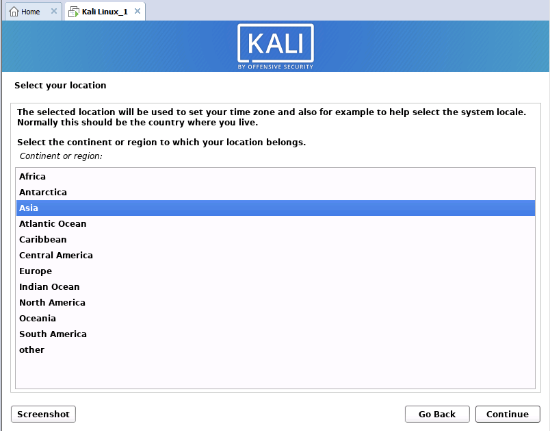 시스템 이름을 정합니다. 저는 Kali로 입력하고 continue를 클릭합니다.