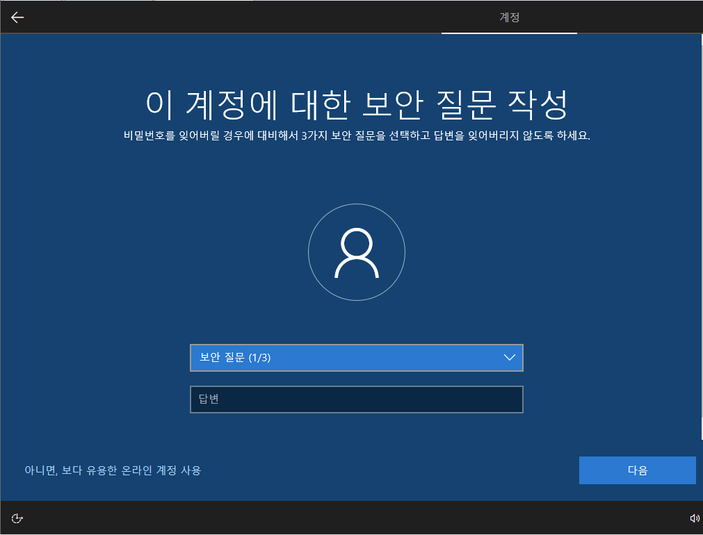 보안 질문 3가지를 설정하고 다음을 클릭합니다.