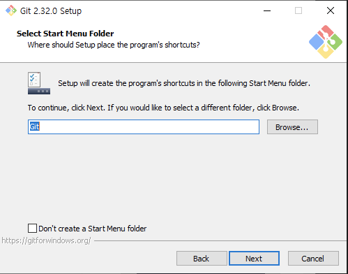 시작 프로그램에 보이게 할 이름 결정 > default값 Git으로 Next