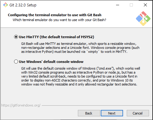 Use MinTTY... - Git bash 터미널 사용 vs Use Windows... - window CMD 사용