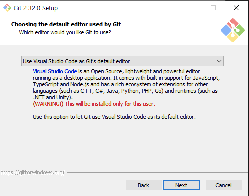 Git Download : https://git-scm.com/Git에서 사용할 기본 편집기를 선택한다.기본값으로 Vim이 선택되어 있다.그대로 NEXT를 눌러 다음 화면으로 넘어간다.$ git init이라는 명령어를 입력하면 초기 Branch가 생