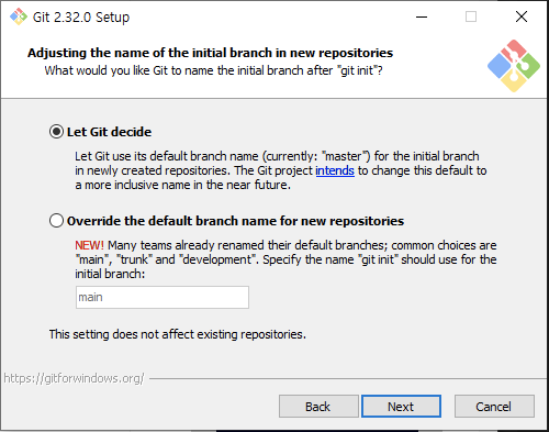 git init 명령어를 입력하면 초기 branch가 생성되는데, 그 branch의 초기 이름 설정법을 선택한다.