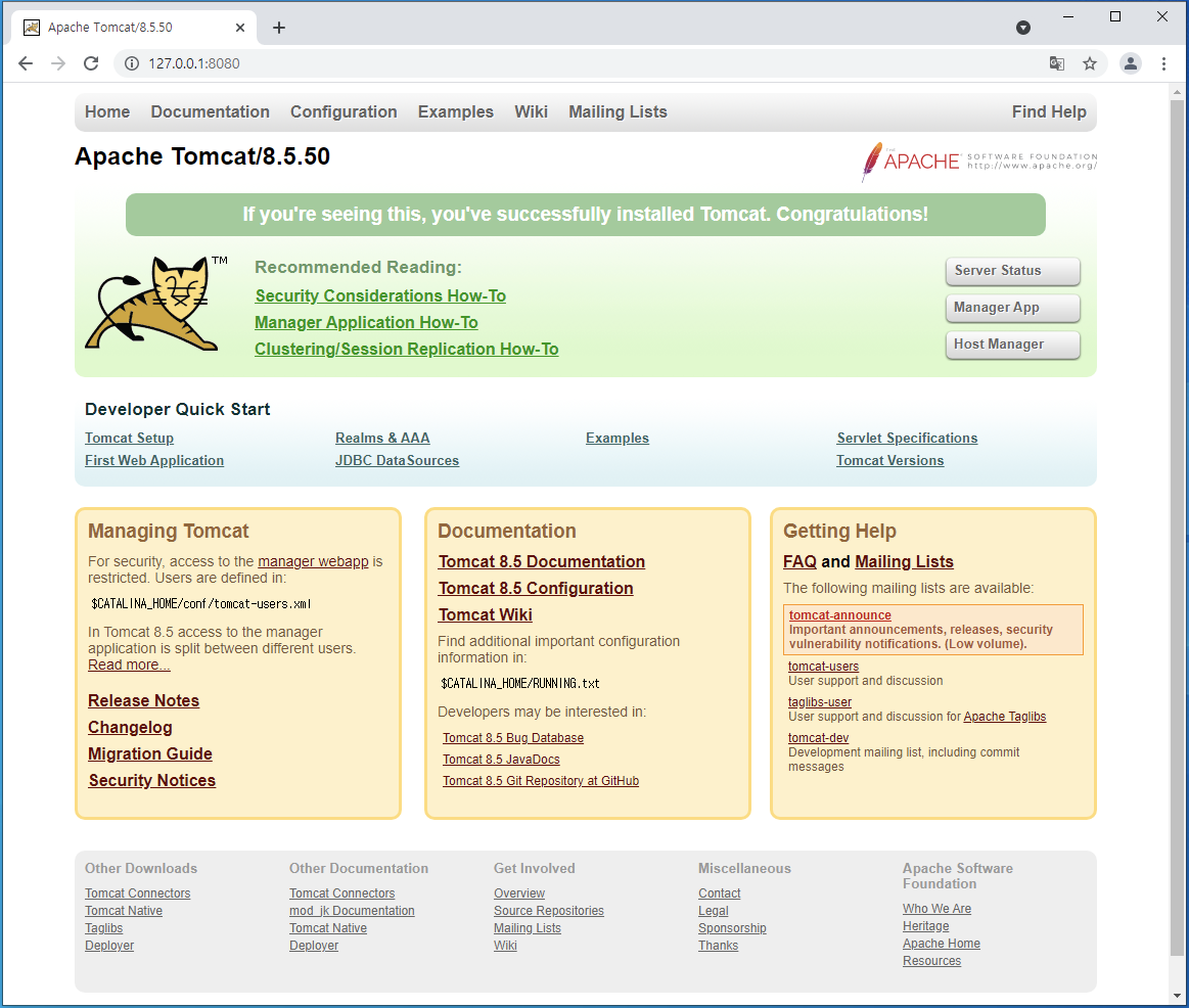 127.0.0.1:8080에 접속하여 아래와 같은 페이지가 나온다면, 정상적으로 설치된 것입니다.