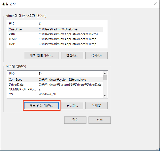 시스템 변수 새로 만들기를 클릭합니다.