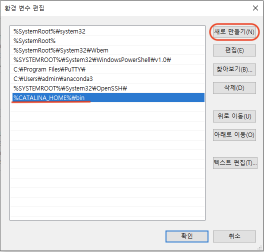 새로 만들기를 클릭하여 %CATALINA_HOME%₩bin을 입력합니다.