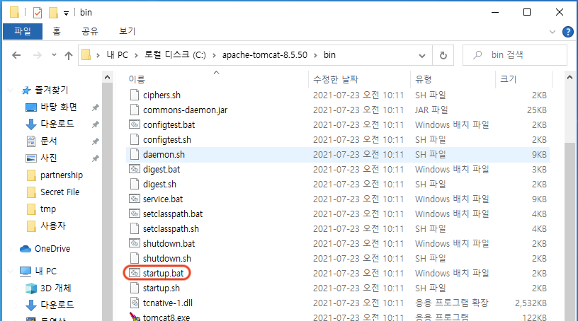 statup.bat을 클릭하여 tomcat 서버를 실행합니다.