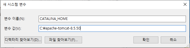 변수명은 CATALINA_HOME으로 입력하고 변수 값으로 tomcat설치 위치를 입력합니다.