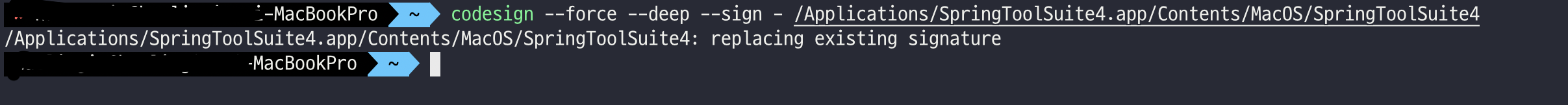 codesign --force --deep --sign - /Applications/SpringToolSuite4.app/Contents/MacOS/SpringToolSuite4