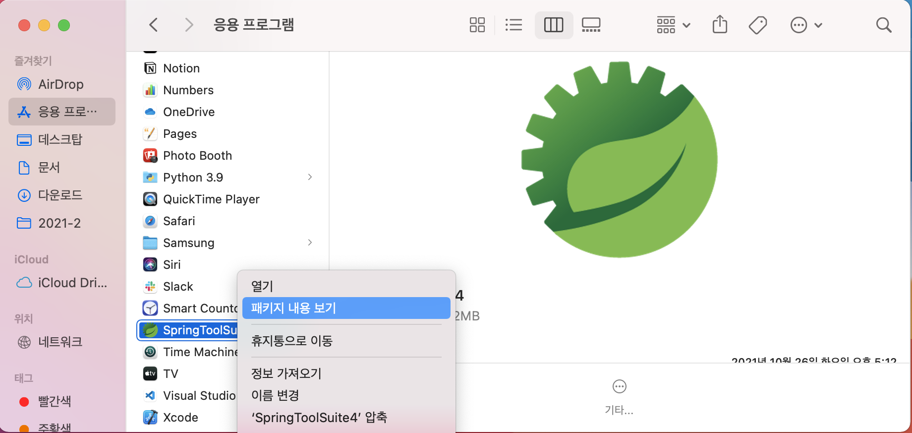 1. 응용 프로그램에서 SpringToolSuite4를 우클릭하여 패키지 내용 보기를 선택합니다.