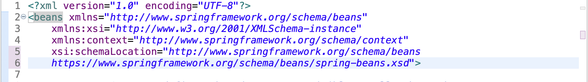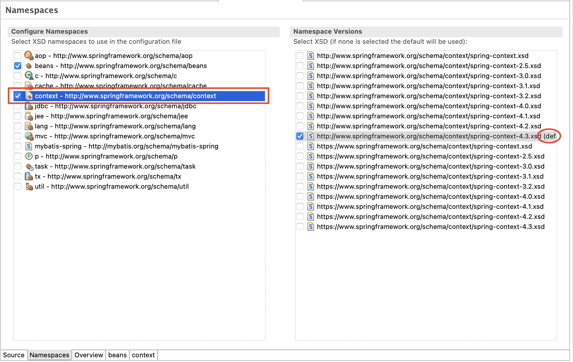 : beans의 xmlns 선언 부분에 context에 대한 부분이 없어서 발생하는 에러이다.
