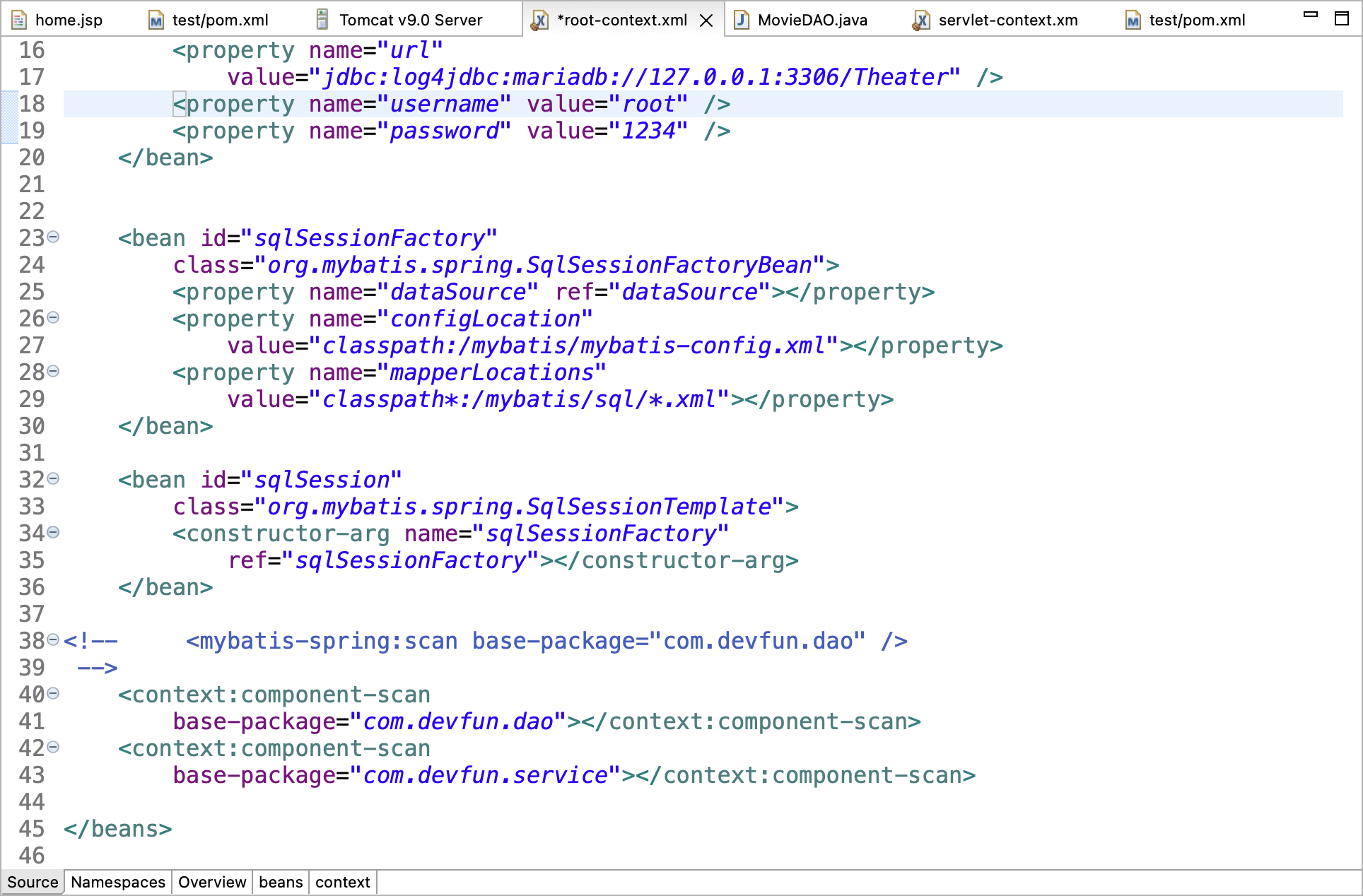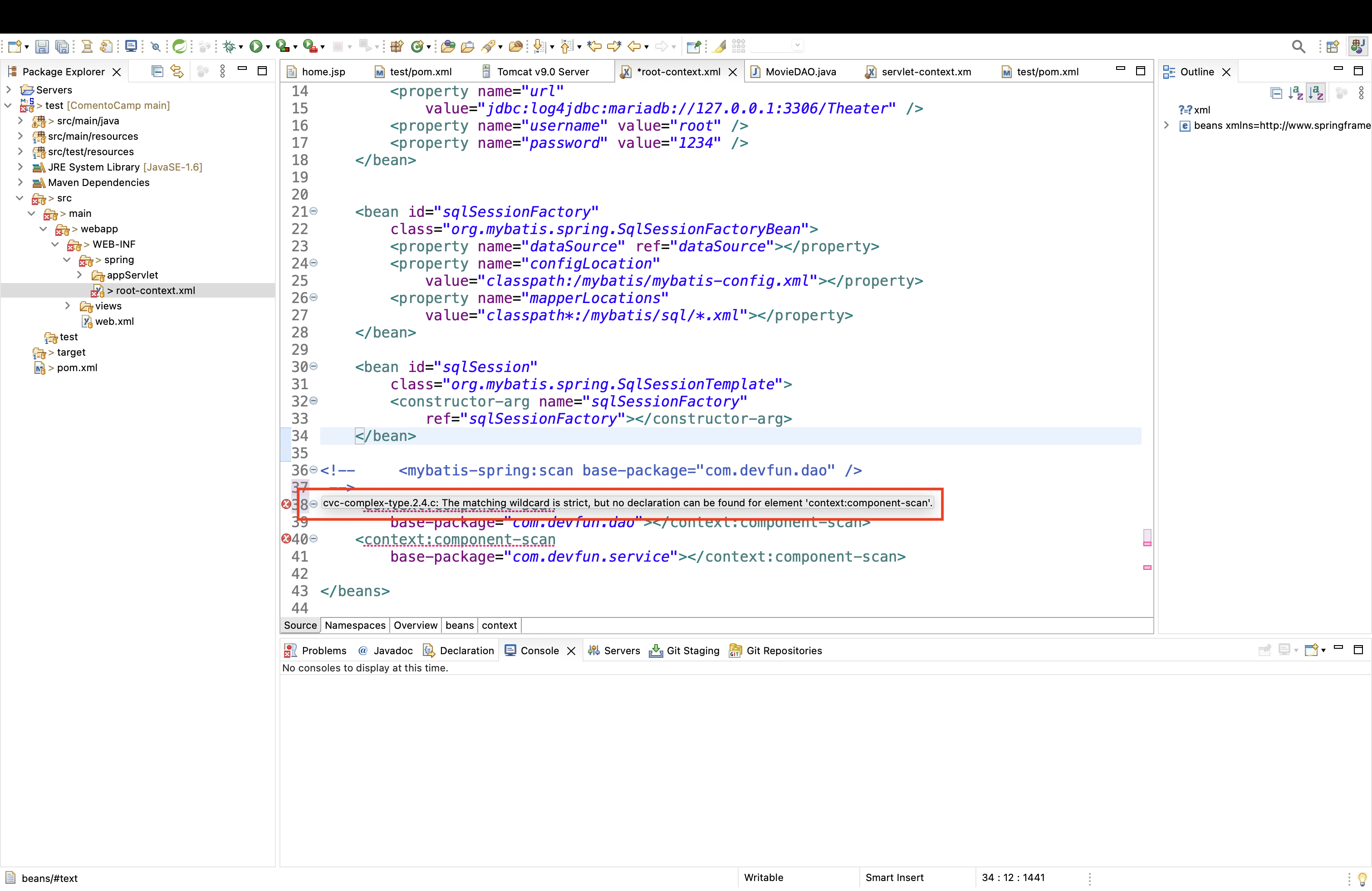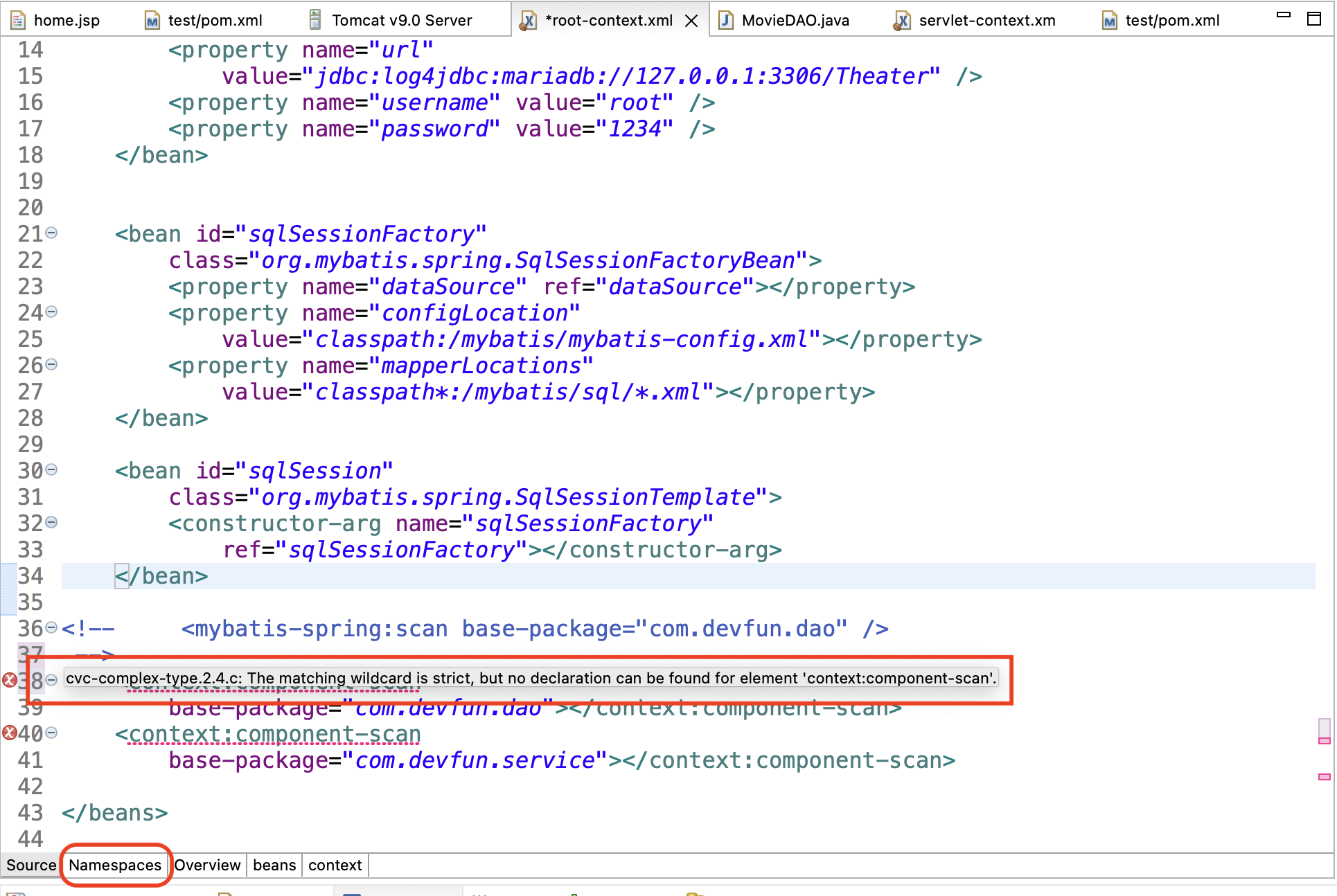 Spring의 root-context.xml을 수정하다가 context:component-scan 태그에 오류가 발생했다.