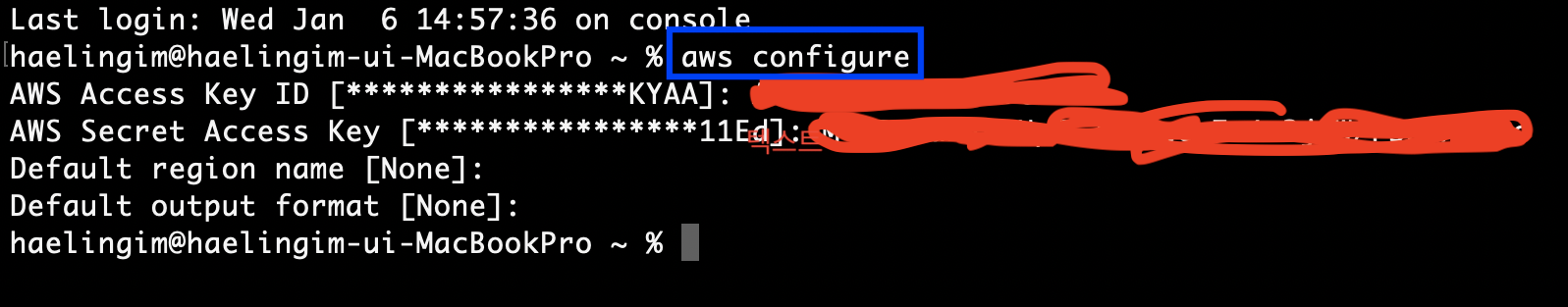 key를 확인하고 aws configure 명령어를 확인하여 aws key를 입력합니다.