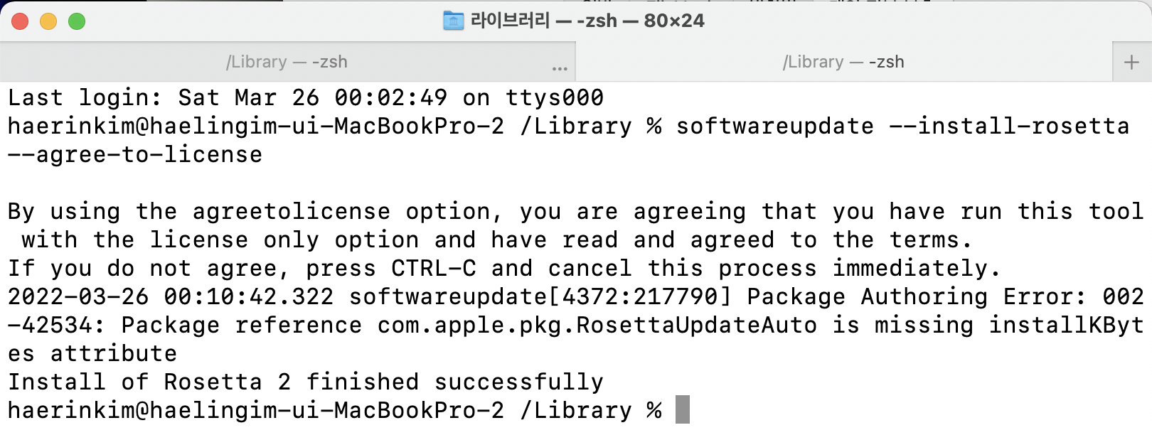 - 인텔 기반 앱을 사용하기 위해 로제타 2 애뮬레이터가 필요하다기에 터미널에